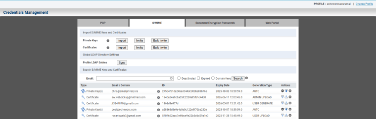 Echoworx allows you to manage private keys. You can view the keys loaded under your profile, including those that are administratively loaded, end-user loaded, or auto-generated. Keys can be expired or deleted directly from the system as needed.