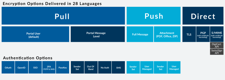 Echoworx provides a variety of encryption methods to suit different needs. Certificate encryption is a key element of its boundary encryption solution, which supports Push, Pull, and Direct methods.